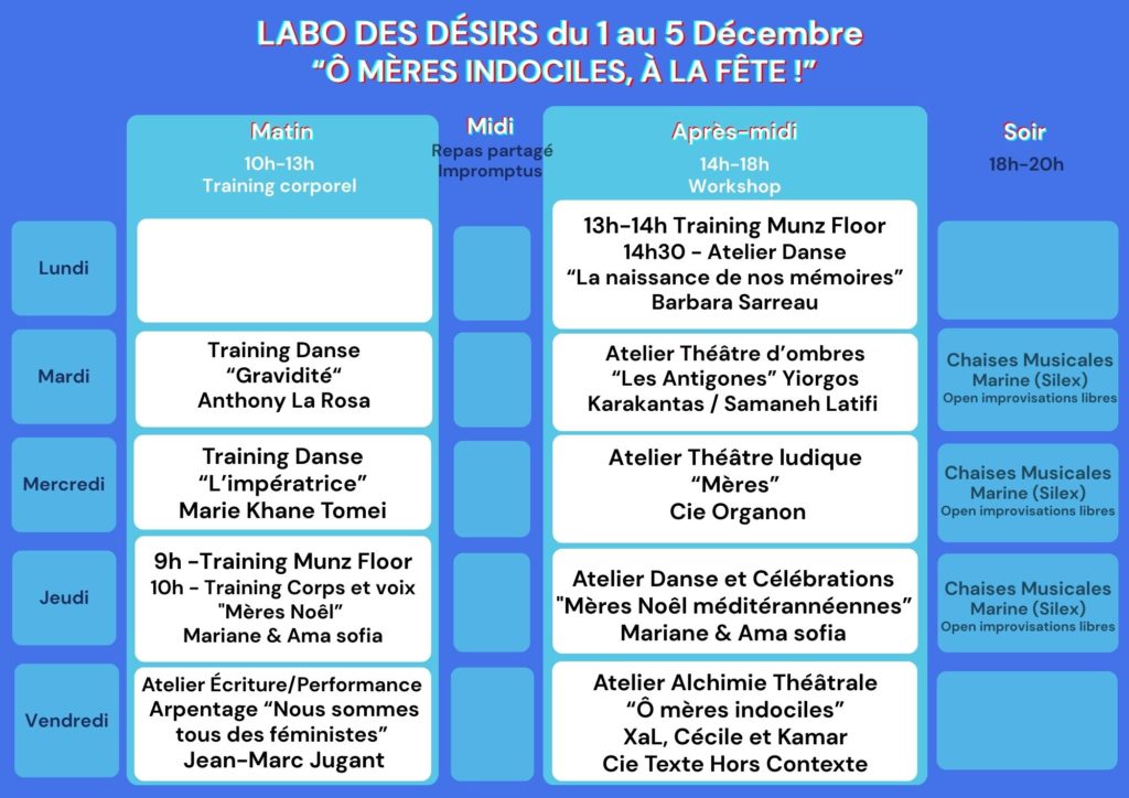 Le Labo des désirs de décembre s’ouvre comme un rituel de joie et d’indocilité. Après avoir exploré en novembre le Royaume des Mères, nous plongeons désormais dans ce qui nous fonde : les origines, les lignées rebelles, les figures qui refusent le silence — des Antigones méditerranéennes aux mères atypiques de Brecht, de Médée aux Mères Noël réinventées.